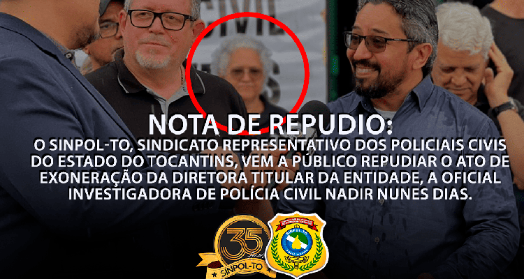 O SINPOL-TO, sindicato representativo dos Policiais Civis do Estado do Tocantins, vem a público REPUDIAR o ato de exoneração da Diretora Titular da entidade, a Oficial Investigadora de Polícia Civil Nadir Nunes Dias.