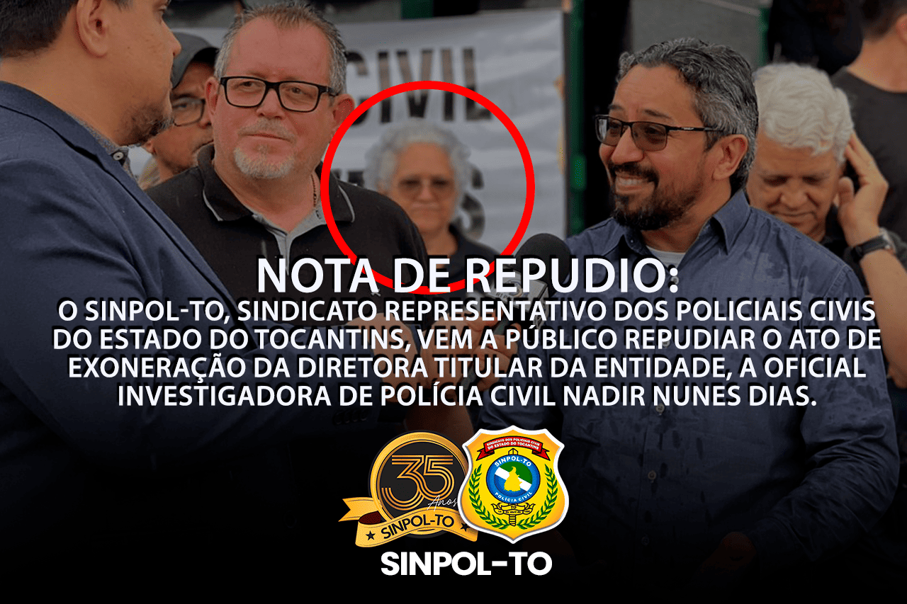 O SINPOL-TO, sindicato representativo dos Policiais Civis do Estado do Tocantins, vem a público REPUDIAR o ato de exoneração da Diretora Titular da entidade, a Oficial Investigadora de Polícia Civil Nadir Nunes Dias.
