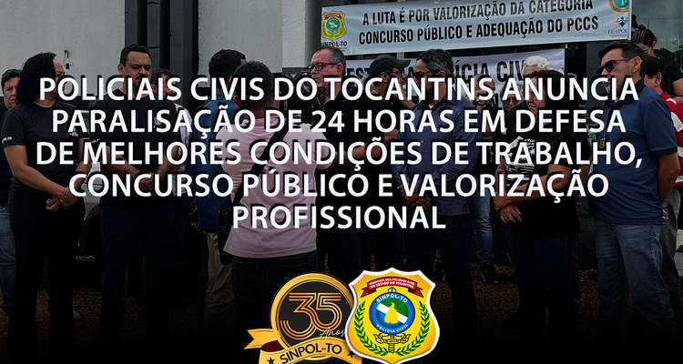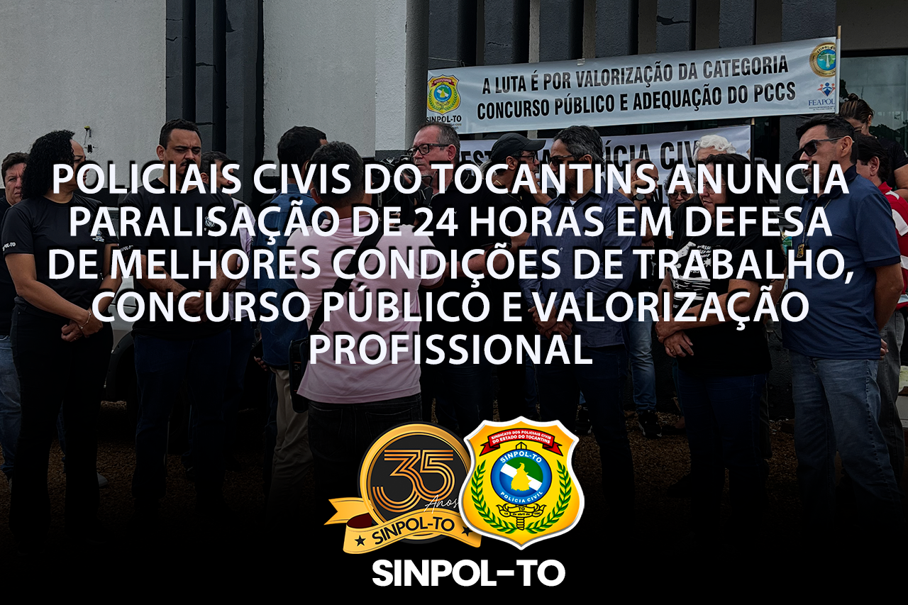 Policiais Civis do Tocantins realiza, nesta segunda feira (24/11) uma paralisação de 24 horas. O movimento, organizado pelas entidades classistas SINPOL-TO e SINDIPERITO, contam com apoio das federações FEIPOL CON e FEAPOL e buscam chamar a atenção do Governo do Estado para problemas que há anos se acumulam e que comprometem tanto o funcionamento da instituição quanto a saúde dos policiais civis.